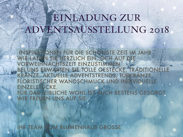 Unser Mitglied, Blumen Grosse, lädt wieder zur jährlichen Adventsausstellung am 25.11.2018 ein. Herr Grosse und sein Team freuen sich auf viele Besucher.